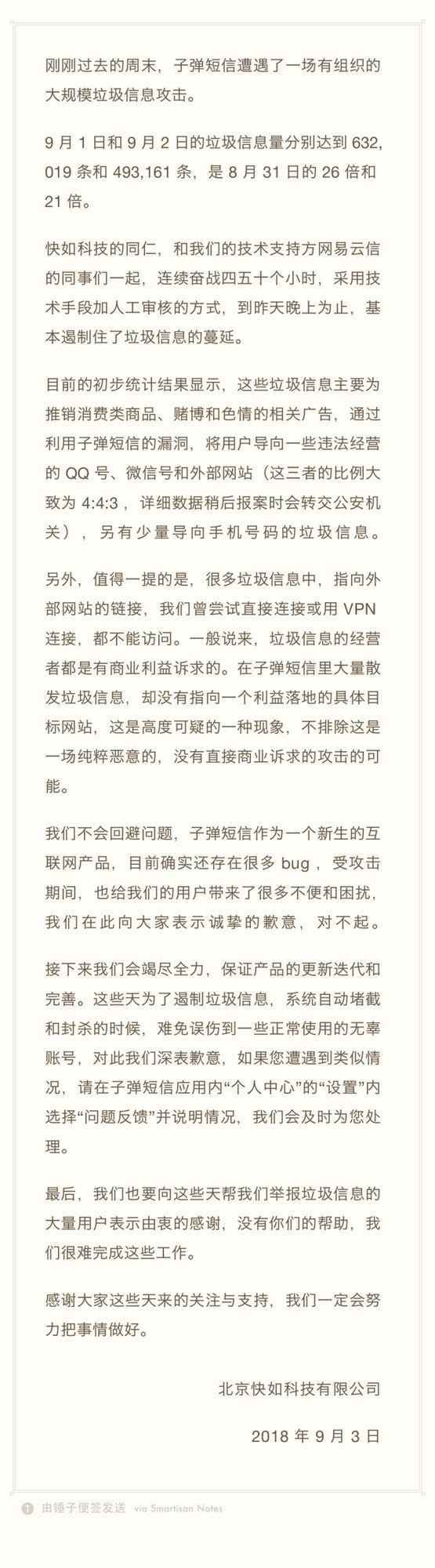 據悉,9月1日-9月2日也就是上周末,子彈短信中的垃圾信息量分別達到632019條和493161條,是8月31日的26倍和21倍??烊缈萍己图夹g(shù)支持方網(wǎng)易云信的團隊一起,連續奮戰了四五十個(gè)小時(shí),采用技術(shù)手段加人工審核的方式,到昨日晚間才基本控制住了垃圾信息的蔓延。