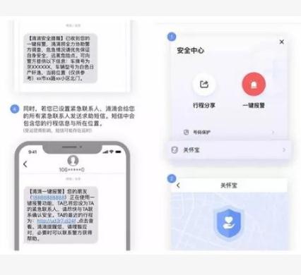 滴滴出行APP“一鍵報警”及相關(guān)短信展示。網(wǎng)頁(yè)截圖