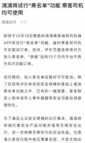 即將于 10 月 18 日更新的滴滴乘客端和司機端 APP 將試行“黑名單”功能,屆時(shí)乘客和司機可在取消訂單、投訴、評價(jià)頁(yè)面選擇將對方加入黑名單,“屏蔽”后的 12 個(gè)月內平臺不再為雙方匹配訂單。