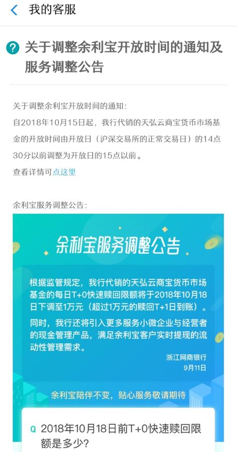 近日,余利寶發(fā)布開(kāi)放時(shí)間調整公告,通知稱(chēng),自 2018 年 10 月 15 日起,余利寶開(kāi)放時(shí)間由開(kāi)放日的 14 點(diǎn) 30 分以前調整為開(kāi)放日的 15 點(diǎn)以前。