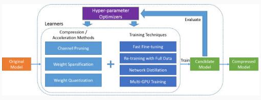 超參數優(yōu)化(hyper-parameter optimization)部分可以通過(guò)強化學(xué)習或者 AutoML,在整體壓縮率一定的情況下,搜索出每一層最合適的壓縮比例使得整體的精度最高。多數開(kāi)發(fā)者對模型壓縮算法往往了解較少,調節壓縮算法參數需要長(cháng)期的學(xué)習和實(shí)驗才能有所經(jīng)驗, 但超參數取值對最終結果往往有著(zhù)巨大的影。PocketFlow 的超參數優(yōu)化部分正是幫助開(kāi)發(fā)者解決了這一大痛點(diǎn),并且通過(guò)實(shí)驗我們發(fā)現,其優(yōu)化結果也要好于專(zhuān)業(yè)的模型壓縮工程師手工調參的結果。其結構如下圖: