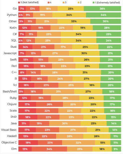 在調查報告中我們看到,在讓開(kāi)發(fā)者給自己使用的開(kāi)發(fā)語(yǔ)言的滿(mǎn)意度進(jìn)行評價(jià)時(shí),Python 和 Go 這兩門(mén)語(yǔ)言獲得的“滿(mǎn)意和非常滿(mǎn)意”評價(jià)比例最高,分別為 68% 和 61%。