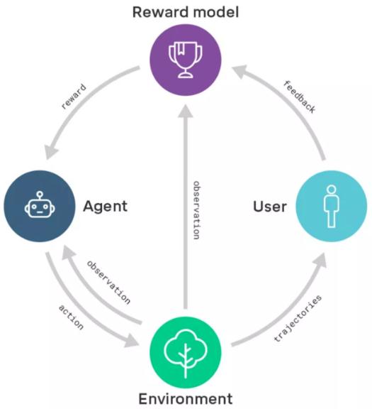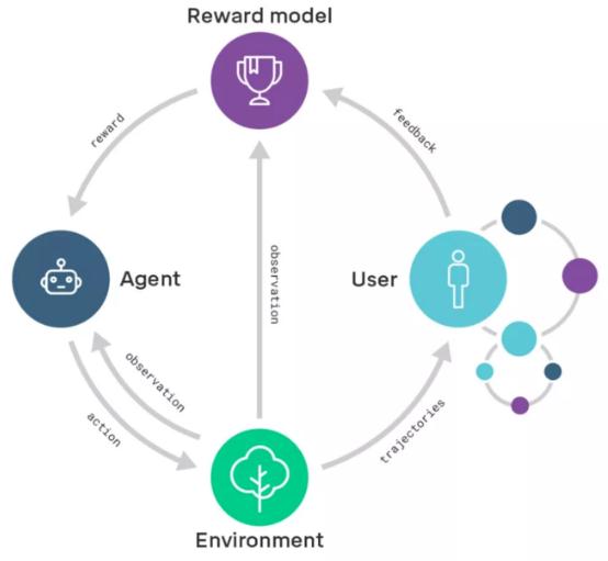 獎勵建模示意圖:獎勵模型基于用戶(hù)反饋進(jìn)行訓練,以便更好地捕捉用戶(hù)意圖;同一時(shí)間,獎勵模型為經(jīng)過(guò)強化學(xué)習訓練的智能體提供獎勵。