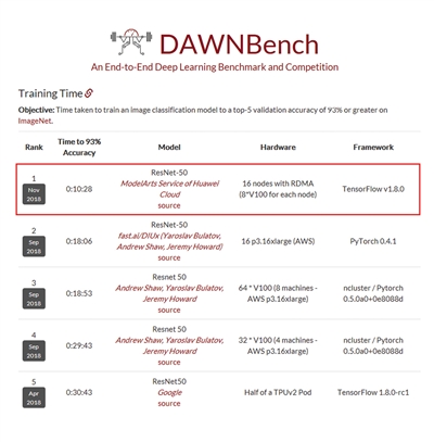 近日,斯坦福大學(xué)發(fā)布了 DAWNBenchmark 的最新成績(jì),在圖像識別(ResNet50-on-ImageNet,93% 以上精度)的總訓練時(shí)間上,華為云 ModelArts 排名世界第一,僅需 10 分 28 秒,比第二名提升近 44%。成績(jì)證明,華為云 ModelArts 實(shí)現了更低成本、更快速度、更極致的體驗。