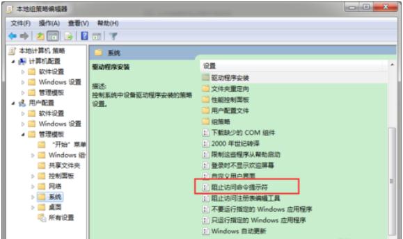 在右側主窗口中找到“阻止訪(fǎng)問(wèn)命令提示符”配置項;