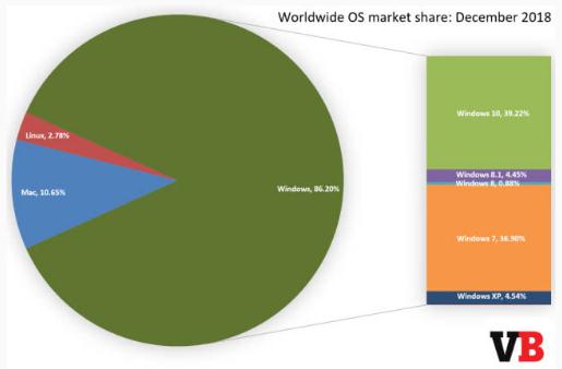 Windows 7 的市場(chǎng)份額下降了 1.99 個(gè)百分點(diǎn),從 38.89% 下降到了 36.90%。這就是 Windows 10 在 2018 年 12 月成為“最流行的桌面操作系統”的原因。Windows 7 的市場(chǎng)份額早在 2012 年 9 月就超過(guò)了 Windows XP,并在 2015 年 6 月超過(guò)了 60%。