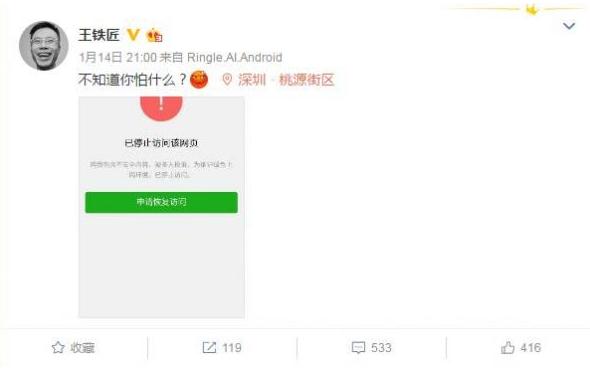 昨日晚間王欣發(fā)布微博稱(chēng):不知道你在怕什么?并配上一張無(wú)法正常訪(fǎng)問(wèn),微信提示網(wǎng)頁(yè)包含不安全內容,被多人投訴的圖片。隨后王欣又發(fā)微博稱(chēng),騰訊大王卡短信也封了馬桶!