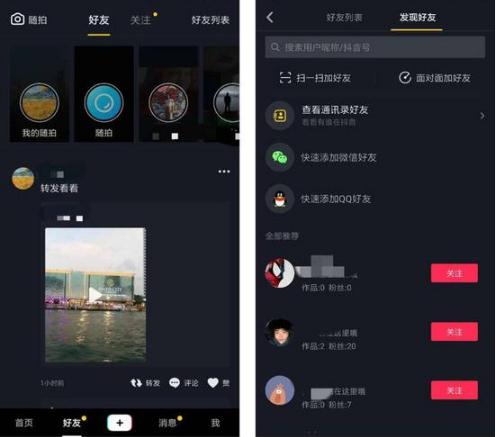 而在多閃發(fā)布的同時(shí),抖音也發(fā)布了一個(gè)新的版本。在抖音的新版里,將好友和關(guān)注單獨分開(kāi),并且將相互關(guān)注的好友視頻列在第一位,也增加了隨拍的功能,基本上把多閃的大部分功能都平移到抖音里。