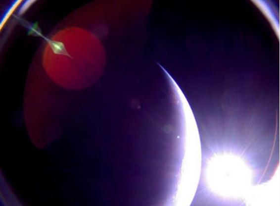 美國東部時(shí)間 2019 年 7 月 6 日凌晨 12:41,行星學(xué)會(huì )“光帆 2 號”通過(guò)安裝在雙面太陽(yáng)能電池板上的攝像機上拍攝到了這張地球輪廓照片。當時(shí)航天器正駛向所處軌道的日落,太陽(yáng)在右邊可見(jiàn)。這張照片未經(jīng)修飾,陽(yáng)光散射效果明顯可見(jiàn)。“光帆 2 號”的雙目魚(yú)眼相機視場(chǎng)約為 180 度,導致畫(huà)面出現一些輕微扭曲和變形。