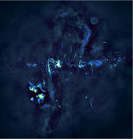 銀河系中央部分的射電圖像。一系列明亮的特征、爆炸的恒星和新恒星誕生的區域勾勒出了星系的平面。從銀河系中心發(fā)射出的射電波氣泡在星系平面上下延伸,許多磁化的絲狀結構平行于氣泡運行。