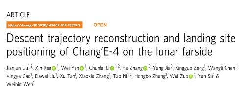 北京時(shí)間9月24日23時(shí),國際頂級學(xué)術(shù)期刊《自然》(Nature)子刊《自然-通訊》(Nature Communications)在線(xiàn)發(fā)表了一篇來(lái)自中國科學(xué)家的成果:Descent trajectory reconstruction and landing site positioning of Chang’E-4 on the lunar farside。中國科學(xué)院國家天文臺副臺長(cháng)、月球與深空探測研究部主任李春來(lái)領(lǐng)導的“嫦娥四號”研究團隊,精確定位了“嫦娥四號”的著(zhù)陸位置,并對“嫦娥四號”的落月過(guò)程進(jìn)行了重建。