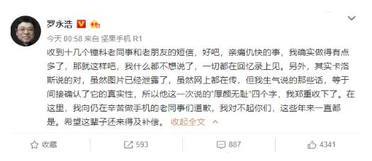 10月9日凌晨,錘子科技創(chuàng )始人羅永浩發(fā)布了一條微博,對于自己不久前有關(guān)堅果手機即將發(fā)布的新手機的評價(jià),他稱(chēng)“在這里,我向仍在辛苦做手機的老同事們道歉,我對不起你們,這些年來(lái)一直都是。希望這輩子還來(lái)得及補償。”