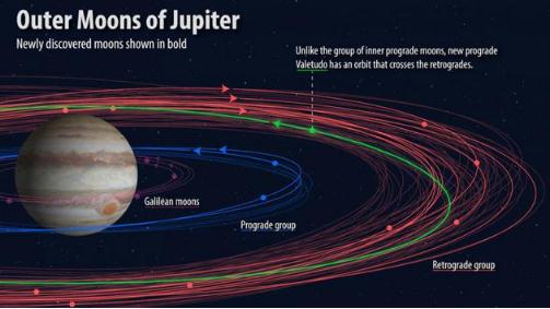 木星衛星的各種分類(lèi),新發(fā)現的衛星軌道以粗線(xiàn)顯示。圖中綠色線(xiàn)顯示的是一顆特立獨行的衛星 Valetudo,以羅馬神朱庇特的曾孫女命名。它穿梭于逆行衛星的軌道間,但本身軌道是順行的。