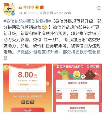 一直以來(lái),微信都是我國最大的社交聊天工具,主要為用戶(hù)提供聊天場(chǎng)景和朋友圈溝通,但是近幾年微信卻興起了一種合作營(yíng)銷(xiāo),“拼團、助力、砍一刀”,每天七大姑八大姨、好友們的聲響,充滿(mǎn)著(zhù)微信聊天、朋友圈和群聊,非常影響用戶(hù)運用微信的體驗。但是現在好了,《規范》實(shí)施后或將對這些線(xiàn)上營(yíng)銷(xiāo)活動(dòng)產(chǎn)生影響。