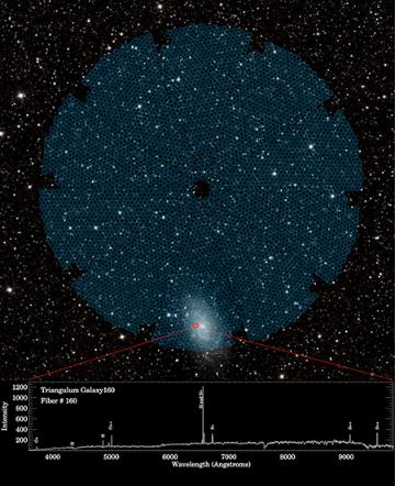 暗能量光譜儀位于亞利桑那州基特峰國家天文臺,它被安裝在尼古拉斯·梅奧爾望遠鏡上。據介紹,暗能量光譜儀擁有 5000 只“眼睛”,每只“眼睛”中都有專(zhuān)門(mén)制作的光纖,它們可收集來(lái)自遙遠宇宙的信息。