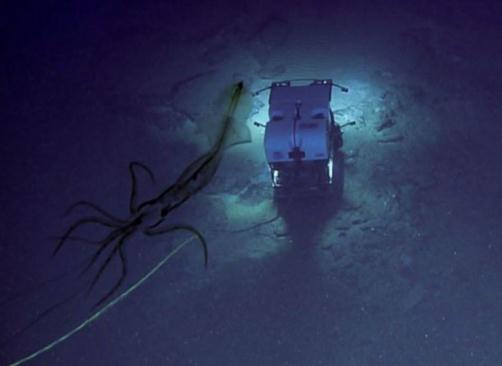 當機器人將明亮的聚光燈照在海床上時(shí),大烏賊的影子輪廓出現在其后部。烏賊顯然對機器人十分感興趣。