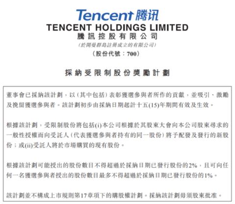 2018年7月,騰訊公告稱(chēng),向15457位獎勵人士授予1720.70萬(wàn)股新股。