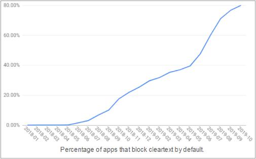 谷歌方面表示,截至 2019 年 10 月,五分之四(80%)可通過(guò)官方 Play 商店下載的 Android 應用程序正在使用 HTTPS 加密各自的網(wǎng)絡(luò )流量。而對于直接針對 Android 9 的應用,該數字甚至更高,達到 90%。這意味著(zhù)進(jìn)入或離開(kāi)這些應用程序之一的流量是經(jīng)過(guò)加密的,第三方無(wú)法攔截或讀取。