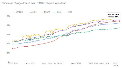 根據該公司的透明度報告,Chrome 內的 HTTPS 使用率現在介于 85% 和 95% 之間,具體取決于平臺。