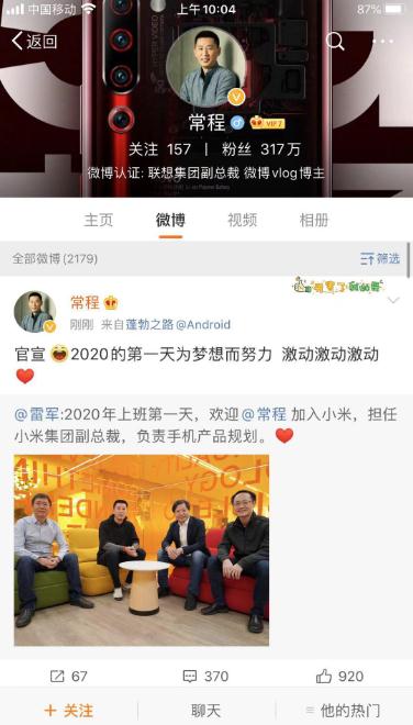 2020 年 1 月 2 日,雷軍發(fā)微博確認,常程加入小米,任職集團副總裁,負責手機產(chǎn)品規劃。常程個(gè)人微博也轉發(fā)確認。