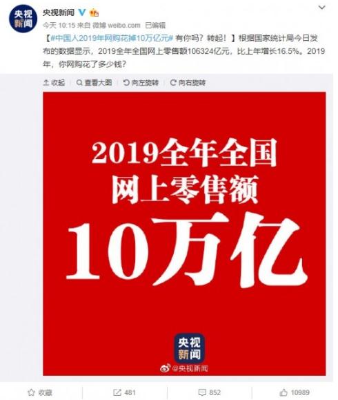 今日,國家統計局發(fā)布的數據顯示,2019全年全國網(wǎng)上零售額106324億元,比上年增長(cháng)16.5%。