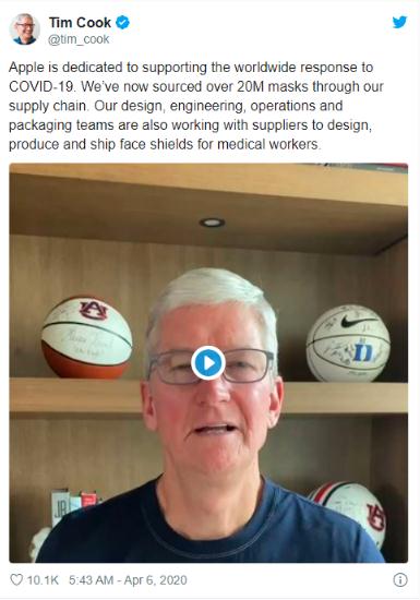 4 月 6 日消息,蘋(píng)果 CEO 蒂姆·庫克今日在社交網(wǎng)絡(luò )分享了一段視頻,介紹了蘋(píng)果公司對新冠病毒做出的最新舉措。