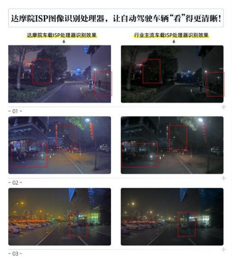 達摩院介紹,自研 ISP 處理器使得車(chē)載攝像頭在白天和夜間的圖像識別能力大幅提升。根據達摩院自動(dòng)駕駛實(shí)驗室的路測結果顯示,使用達摩院 ISP 處理器,車(chē)載攝像頭在夜間這個(gè)最富有挑戰的場(chǎng)景下,圖像物體檢測識別能力比業(yè)內主流處理器有 10% 以上的大幅度提升,原本模糊不清的標注物也得以清晰識別。
