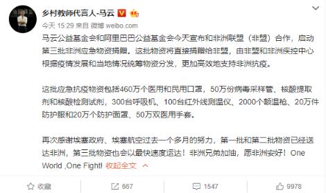 馬云表示:“非洲兄弟加油,愿非洲安好!One World, One Fight!”