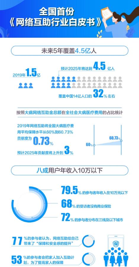 5 月 7 日,螞蟻集團研究院發(fā)布全國首份《網(wǎng)絡(luò )互助行業(yè)白皮書(shū)》。2019 年我國網(wǎng)絡(luò )互助平臺的實(shí)際參與人數為 1.5 億,預計 2025 年將達到 4.5 億人,覆蓋中國 14 億人口的 32% 左右。