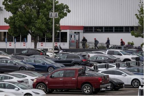 圖示:工人走進(jìn)特斯拉弗里蒙特工廠(chǎng)