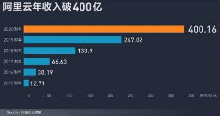 財報顯示,2020 財年內(2019 年 4 月至 2020 年 3 月底),阿里云營(yíng)收為 400.16 億元。對比歷史數據,2015 財年阿里巴巴首次披露云計算營(yíng)收,當年阿里云收入為 12.71 億元,到現在年度營(yíng)收 400 億元,六年間增長(cháng) 31 倍。