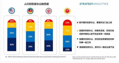 通過(guò)對美國、德國、英國和中國的 5000 多名消費者進(jìn)行問(wèn)卷調查,Strategy Analytics 消費者洞察團隊發(fā)布了最新的免費報告《疫情前后的在家辦公情況》。報告指出,疫情之后,許多員工已經(jīng)準備好接受在家辦公。
