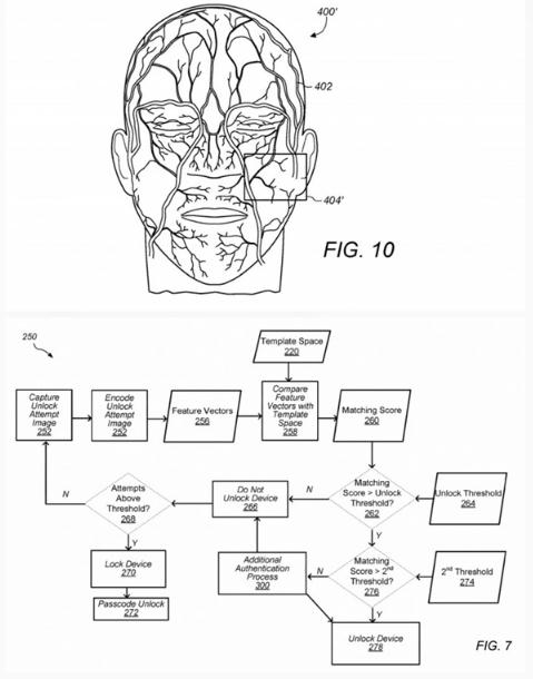 專(zhuān)利中包括了使用次表皮圖像技術(shù)創(chuàng )建用戶(hù)靜脈的 3D 地圖,例如相機中的紅外傳感器從照亮用戶(hù)面部的紅外照明器中捕捉到泛光和斑點(diǎn)圖案。這與目前 Face ID 的工作方式有些類(lèi)似,即在用戶(hù)的臉上以圖案形式發(fā)出紅外線(xiàn),并由成像設備讀取。
