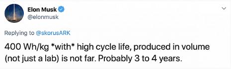 馬斯克:特斯拉有望在 3 到 4 年內批量生產(chǎn) 400Wh/kg 電池