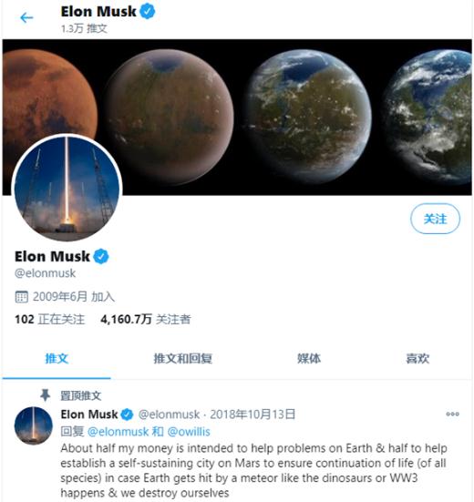 在馬斯克的個(gè)人推特上,他置頂了一條 2018 年發(fā)布的推文,對自己的個(gè)人財富做了大致的一個(gè)分配:一半用于地球,一半用于火星。