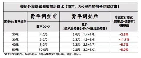 在長(cháng)沙,一位老長(cháng)沙口味湘菜的老板表示,因為店鋪3公里以?xún)冉鼏握急冗_70%,所以費率調整后,雖然有部分遠距離訂單收費增加,但多數近單降了,核算下來(lái)店鋪的總體成本降了。在鄭州,金水區升龍廣場(chǎng)經(jīng)營(yíng)灌湯燒餅的齊先生也表示,換了新費率之后,3公里范圍內訂單的傭金成本明顯減少,對他的成本降低有不少幫助。