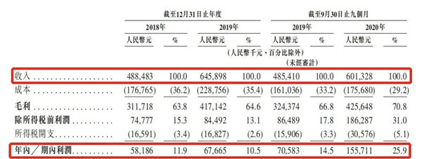 而比起快速的增長(cháng)速度,令人矚目的恐怕是它的毛利率水平。據招股書(shū)顯示,2018年至2019年,該公司的毛利率分別為63.8%、64.6%,逐年提升;而經(jīng)調整凈利率期內則為18.9%、20.2%,亦不斷提升。