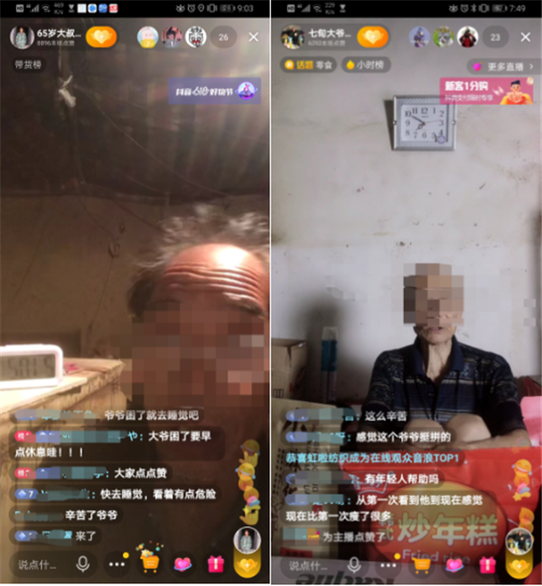 直播時(shí),很多網(wǎng)友評論“如果你被綁架了就眨眨眼”,其實(shí)也是在擔心老人深夜直播是否是被人脅迫,而他們的幕后操手無(wú)非就是那些追逐金錢(qián)與流量的年輕人。