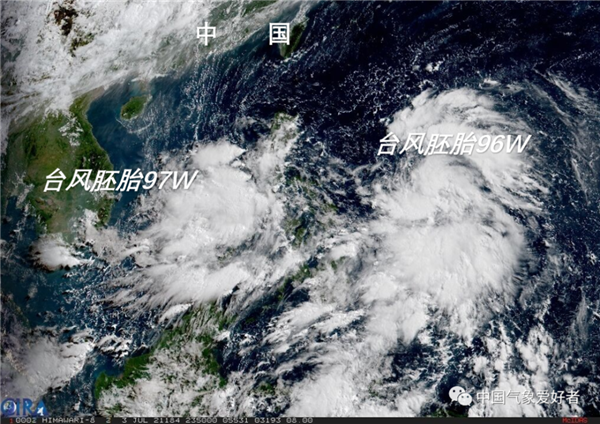 7月4日白天,西北太平洋上有兩個(gè)臺風(fēng)胚胎快速發(fā)展。其中,菲律賓以東洋面上的臺風(fēng)胚胎,編號為96W;我國南海上的臺風(fēng)胚胎,編號為97W。