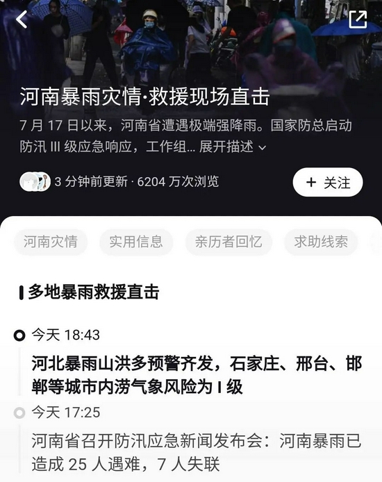 到21日晚9點(diǎn),知乎熱榜上方的“河南暴雨”專(zhuān)欄入口已有6200余萬(wàn)次瀏覽。該專(zhuān)欄中,救援直擊、親歷者回憶、求助線(xiàn)索、自救指南、暖心瞬間等多個(gè)板塊實(shí)時(shí)更新,從當地情況、經(jīng)驗分享的多個(gè)角度為受災群眾、關(guān)注著(zhù)的網(wǎng)友們提供可用的信息。央視新聞在制作暴雨自救指南時(shí),采用了知乎答主“甄昊元”的回答,該答主在文中說(shuō)道:“全文可以轉發(fā),無(wú)需標注出處。”
