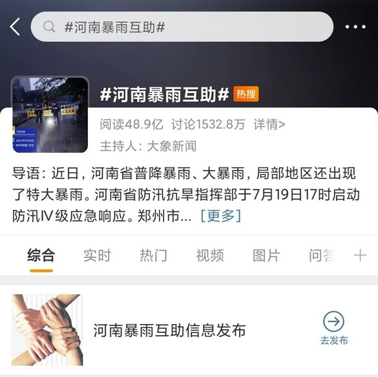 從7月20 日上午開(kāi)始,微博熱搜一半以上為河南暴雨相關(guān)話(huà)題,1500多條求助信息通過(guò)微博發(fā)出。下午5點(diǎn)20分,微博開(kāi)通#河南暴雨互助#通道,將其置頂在熱搜榜最上方,并接入相關(guān)超話(huà)和話(huà)題頁(yè)。話(huà)題中,受困人員或轉達者將所困地址、人數、現狀等系列情況發(fā)布,供外界傳播或聯(lián)系。