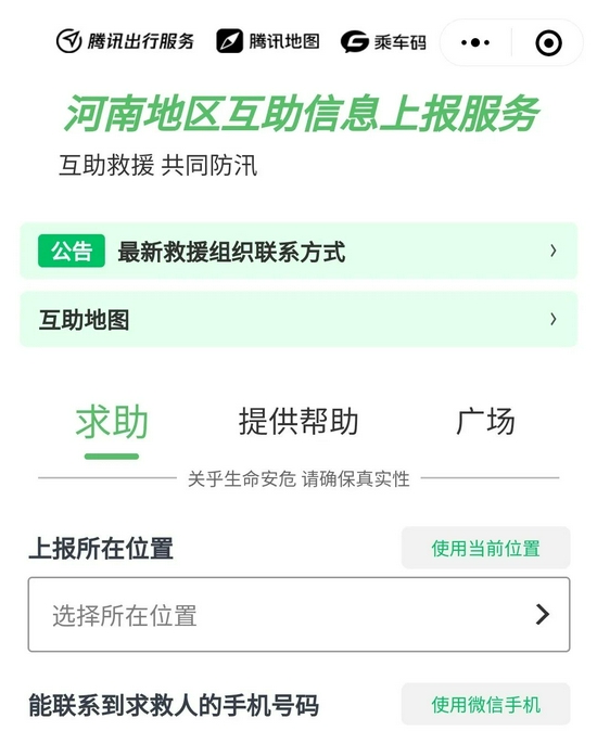 21日晚,騰訊出行服務(wù)聯(lián)合騰訊地圖、乘車(chē)碼上線(xiàn)河南汛情互助救援服務(wù)小程序。小程序中,當地民眾可以自行發(fā)布求助或提供幫助的信息,并在廣場(chǎng)界面瀏覽全部?jì)热?,?jiǎn)潔的頁(yè)面讓救援工作得以更加高效地進(jìn)行。