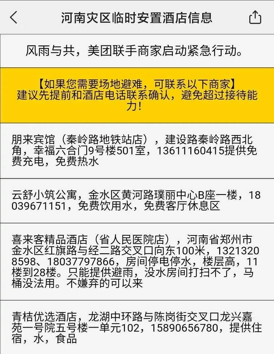 緊急避難所方面,美團收集了河南多家可提供避難服務(wù)的酒店商戶(hù),用戶(hù)在美團及大眾點(diǎn)評App上搜索“河南加油”關(guān)鍵詞,或聯(lián)系客服,即可獲取相關(guān)信息。為了鼓勵公益援助,美團還將對這些商戶(hù)提供補貼等扶持。