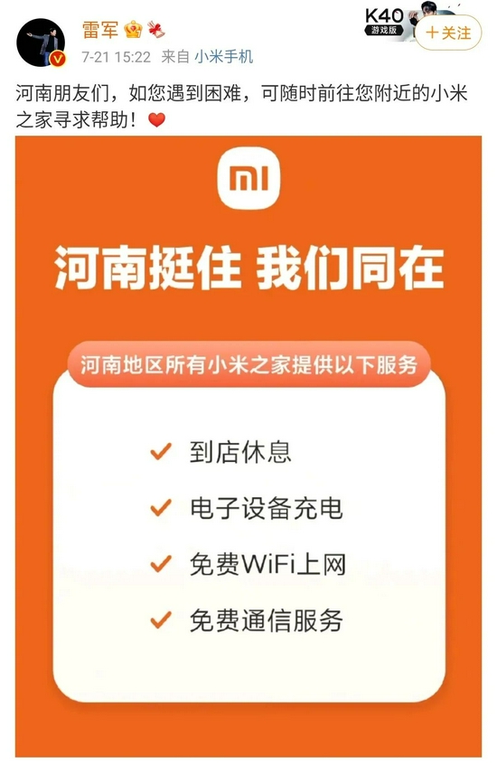 小米公益基金會(huì )捐款5000萬(wàn)元,并緊急動(dòng)員小米河南分公司員工參與當地救援行動(dòng),雷軍表示,河南地區所有小米之家為受災群眾提供休息、充電等服務(wù);聯(lián)想捐款5000萬(wàn)元,同時(shí)提供著(zhù)IT設備修復、數據中心恢復等專(zhuān)業(yè)服務(wù),在技術(shù)層面提供幫助;華為正努力維護與恢復災區通信,河南代表處的187名工程師投身一線(xiàn),暴雨傾盆之下,面臨生命危險的技術(shù)人員們?yōu)榫仍袆?dòng)“保駕護航”。