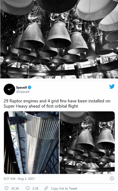 據外媒報道,SpaceX 和埃隆·馬斯克急切地向世界展示,第一個(gè)所謂的“全堆棧”Starship 原型機即將在德克薩斯州完成。該公司于當地時(shí)間周一在 Twitter 上發(fā)布照片稱(chēng):“在 Super Heavy(超重型)首次軌道飛行之前,已經(jīng)安裝了 29 臺 Raptor 引擎和 4 個(gè)柵格翼。”