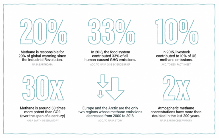 牛是反芻動(dòng)物,意味著(zhù)它們有專(zhuān)門(mén)的消化系統,可以處理人類(lèi)和大多數其他動(dòng)物無(wú)法消化的食物,如新鮮的草和未煮熟的谷物。當食物進(jìn)入牛的胃部時(shí),會(huì )經(jīng)歷一個(gè)稱(chēng)為腸道發(fā)酵的過(guò)程:微生物和細菌部分分解食物顆粒,然后在胃部稱(chēng)為瘤胃的部分發(fā)酵。隨著(zhù)食物顆粒的發(fā)酵,它們產(chǎn)生甲烷。每次牛打嗝--以及在較小程度上打嗝--甲烷都會(huì )被排出并進(jìn)入大氣層,在那里它是一種溫室氣體。