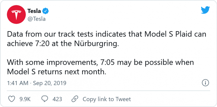 然而特斯拉從未公布過(guò)任何官方的圈速,但現在情況似乎有所改變,埃隆·馬斯克在 Twitter 上發(fā)文稱(chēng),特斯拉在紐伯格林賽道創(chuàng )造了 EV 的世界紀錄。