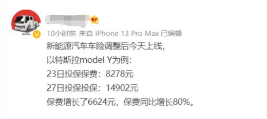 有網(wǎng)友曝光,同樣是特斯拉 Model Y,23 日投保的費用為 8278 元,而 27 日新政之后,投保費用暴漲到 1.4 萬(wàn)多元,漲幅高達 80%。