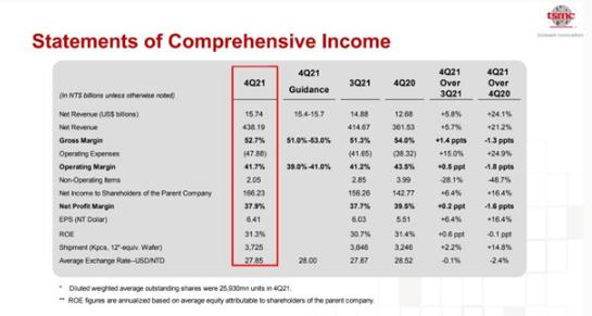 據財報顯示,臺積電第四季度毛利率為 52.7%,僅比第三季度高出 1.4%,甚至同比去年還下降了 1.3 個(gè)百分點(diǎn),凈利潤達到了 41.7%。