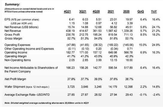 據財報顯示,臺積電在 2021 年第四季度的營(yíng)收高達 157.4 億美元,同比增長(cháng) 21.2%,這也是臺積電連續第六個(gè)季度實(shí)現營(yíng)收增長(cháng),并且持續創(chuàng )下新高。由此綜合 2021 年全年來(lái)看,臺積電的營(yíng)收為 568.2 億美元,相較于 2020 年增長(cháng)高達 24.9%。